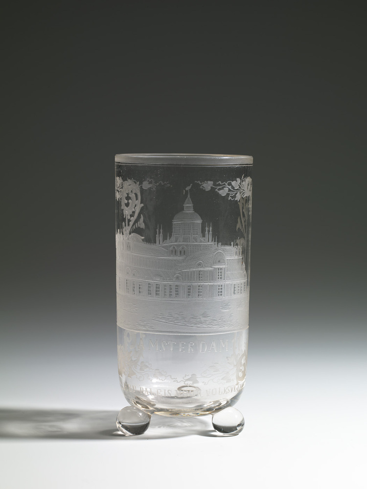 Helder kleurloos glas. Vlakke bodem op drie massieve bolle knopen. Cilindrisch lichaam met afgeronde basis. Op lichaam het Paleis voor Volksvlijt te Amsterdam, gezien vanaf het Frederiksplein. Aan weerszijden gestileerde bladranken. Onder voorstelling het opschrift: AMSTERDAM./ HET PALEIS VOOR VOLKSVLIJT/. Band onder mondrand. Gepolijste details.