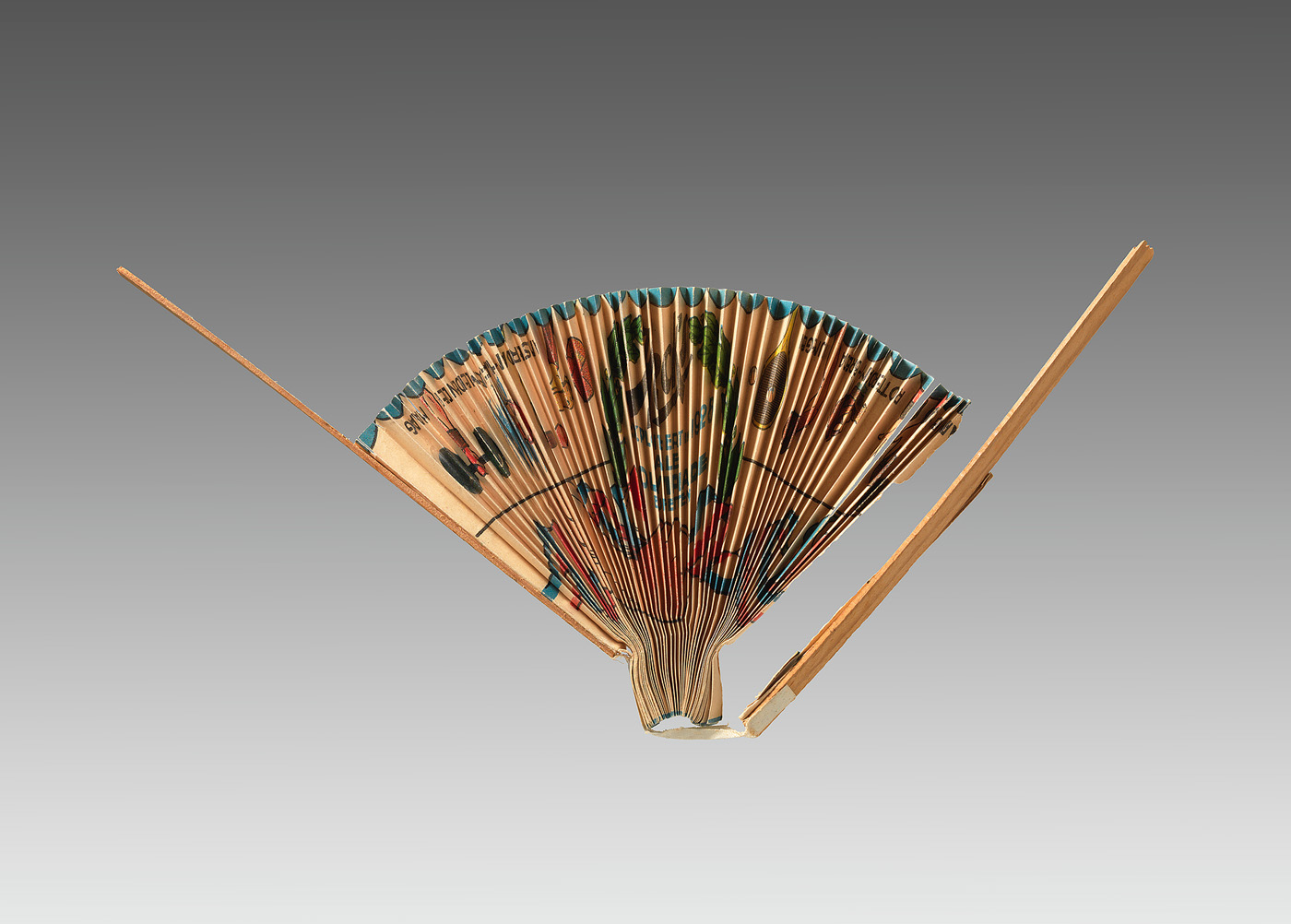 opschrift voorkant waaier: Heck's Olympiade buffetten 1928/ Amsterdam Haarlem Leiden Den Haag Arnhem Rotterdam Breda Nijmegen: in div. kleuren; de plaatsnamen als rondschrift
