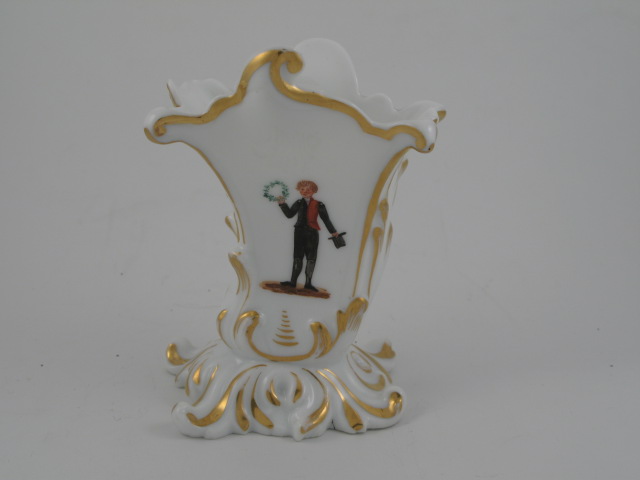 Wit poselein, polychroom beschilderd en verguld. Gecontourneerde voet in de vorm van gestileerde bladmotieven. Asymmetrischschildvormig lichaam, geflankeerd door C en S-vormige voluten in reliëf. Bovenrand asymmetrisch geschulpt. De diverse decoratiemotieven deels verguld. De voorzijde polychroom beschilderd met voorstelling van een Burgerweesjongen, met in zijn linkerhand een hoed en met zijn rechterhand een bladerkrans houdend. Op achterzijde in vergulde letters het opschrift: De Burgerweesjes/ aan hunnen lieve/ Vader/ Stijger./ 27 Nov:/ 1841./.