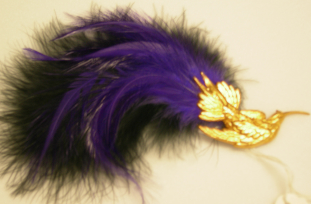 Vogel van goudkleurig metaal, zwarte en paarse veren als staart.- Trefwoorden