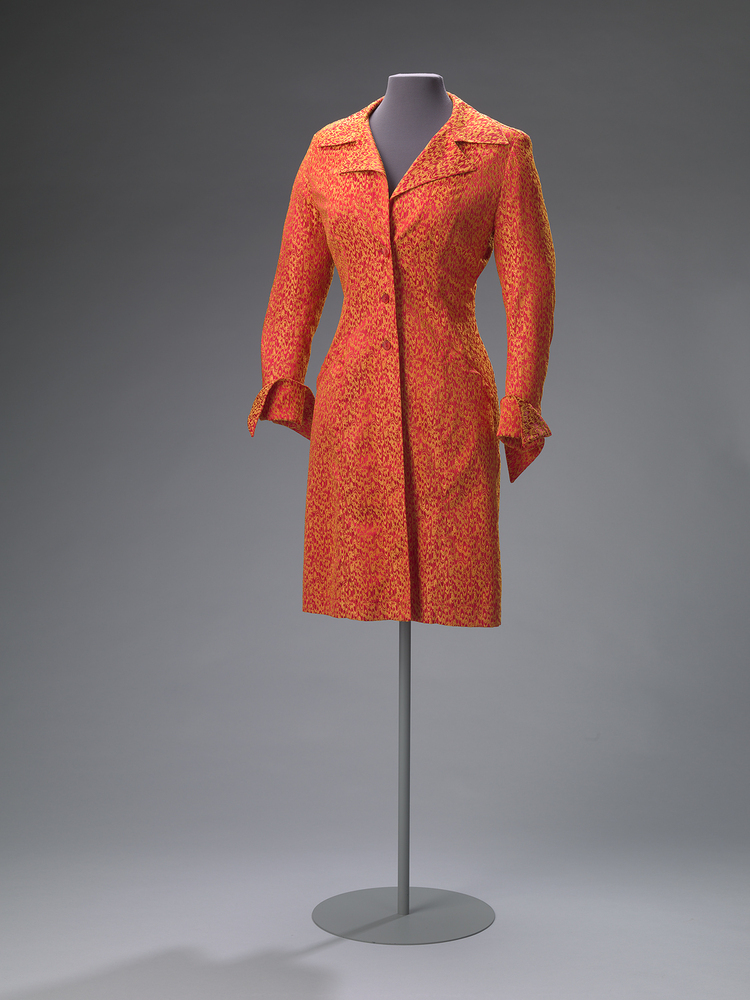 Getailleerde ongevoerde jas, reverkraag, schuine steekzakken op heuphoogte. Midden achter open split beginnende iets onder de taille. Lange bij de pols iets uitlopende vrij strakke mouw, splitten bij de pols van 13 cm. De jas-jurk wordt middenvoor gesloten d.m.v. drie oranjekleurige knopen. De stof is licht rekbaar in de breedte en heeft het uiterlijk van een zware kwaliteit satijn. Oranje/rood, goud/geel.