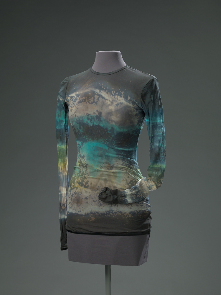 Dit t-shirt met de naam 'LYNN' is vervaardigd door het Amsterdamse modelabel Puck & Hans, opgericht door modeontwerpersechtpaar Puck Kroon (1941) en Hans Kemmink (1947). In 1967 openden Puck & Hans hun eerste winkel in Den Haag. Vanaf 1974 hadden ze ook een boetiek aan het Rokin te Amsterdam, met exclusieve en praktische kleding in moderne, eigenzinnige stoffen. De stijlvolle etalage aan het Rokin was voor voorbijgangers altijd een lust voor het oog. Begin 1998 is de winkel gesloten. ( Sarah Remmerts de Vries)