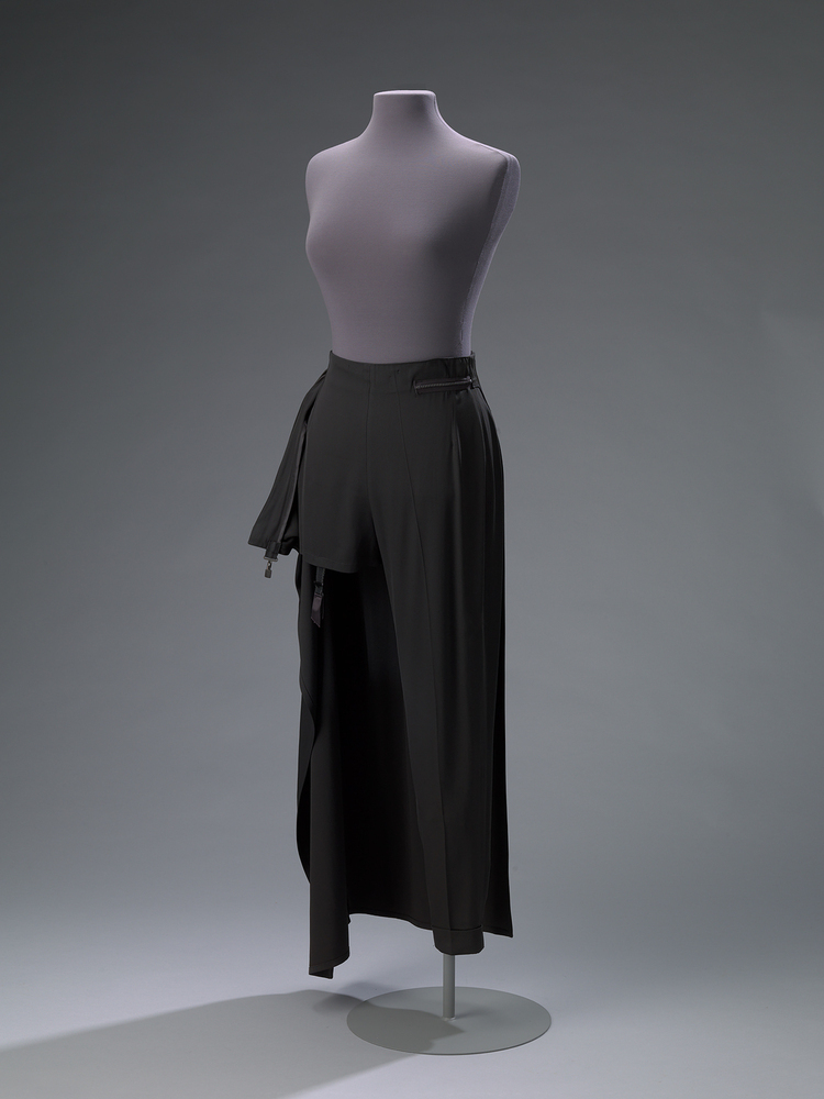Langebroek waarvan de rechterpijp afgeknipt is tot short, bedekt door een lange sluike wikkelrok waarvan de linkerzijnaad niet dichtgestikt is, waardoor bij het lopen de linker broekspijp tevoorschijn komt. De rok is op taillehoogte bij de linkerzijnaad vastgestikt aan de broek en aan de rechterkant in de taille vastgemaakt aan de broek d.m.v. een zwarte drukknoop, hierdoor onstaat er één geheel.