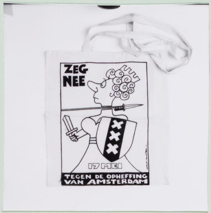 Beige katoenen tas met twee lange draaghengsels. Aan één zijde een voorstelling van de Amsterdamse Stedemaagd in de kleuren rood en zwart. Het hoofd wordt door een voorbij vliegende dolk van de romp gescheiden. Op het heft de letters: /ROA/. In zwart en witte letters de tekst: ZEG NEE/ 17 MEI/ TEGEN DE OPHEFFING VAN AMSTERDAM