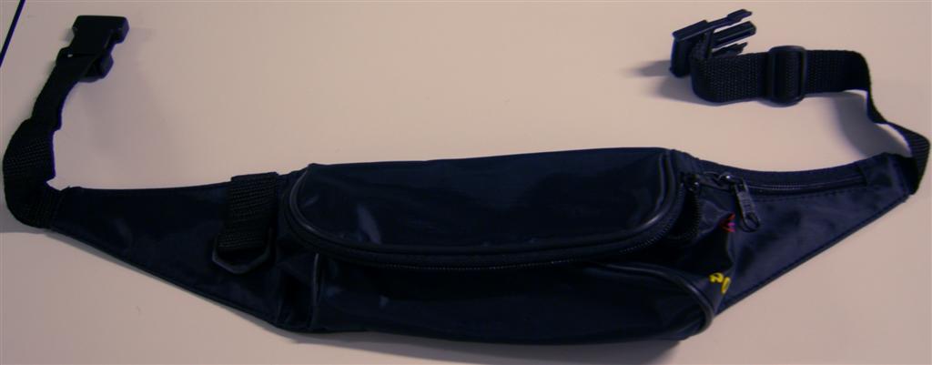 Zwart nylon heuptasje met drie ritsen en verstelbare tailleband.- Trefwoorden