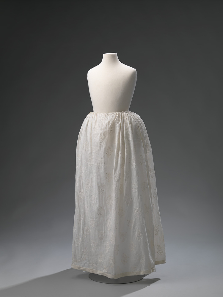 Witte rok met motief met geborduurde bloem met een uitgetrokken kern, getamboereerd. De stof is te dateren door dit motief in de periode 1795-1800. Ook de twee zijsplitten en de linnen band op de zoom wijzen erop dat het een japonrok uit het einde van de 18e eeuw. In de periode daarna is de rok afgeknipt. Er is geen voorsplit.