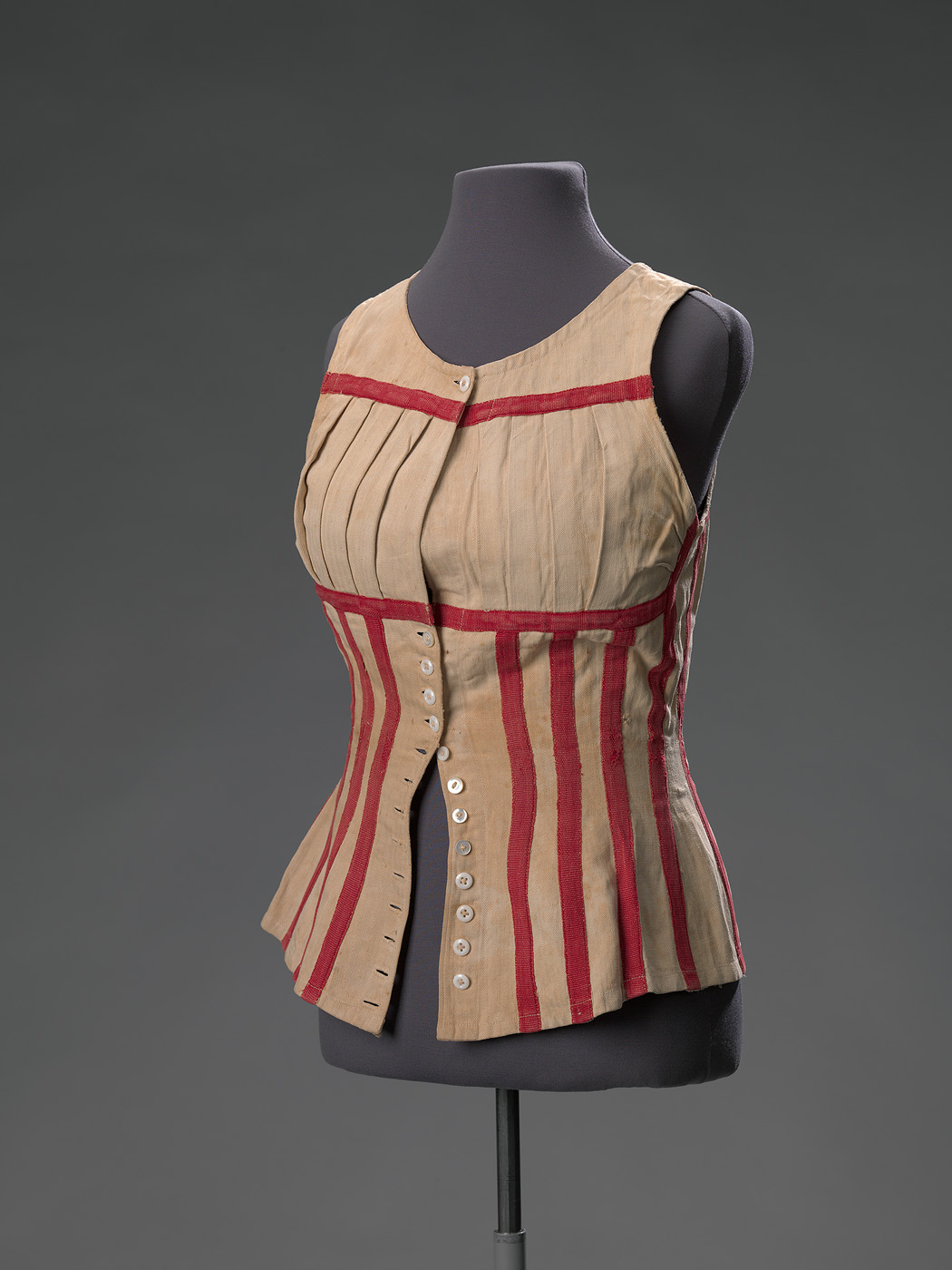 Onderlijfje van stevig crèmekleurig katoen (met keperbinding in visgraatmotief). De coupenaden zijn afgewerkt en verstevigd met rood katoenen band. Ronde hals, mouwloos model. Middenvoor een knoopssluiting met 14 knoopsgaten en 13 witte knopen van glas en parelmoer (de onderste knoop ontbreekt). Ter hoogte van de buste is er een verticaal geplooide baan in de voorpanden gezet. De achterpanden zijn op tailleniveau verstevigd met een opgestikte katoenen band.