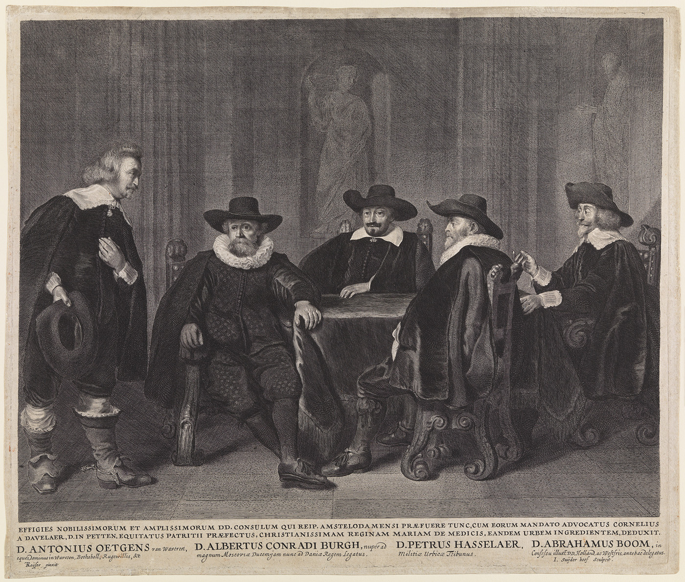 De burgemeesters van Amsterdam in afwachting van het bezoek van Maria de Medici in 1638 papier hoogte a: 32.8 cm; hoogte b: 32 cm; hoogte c: 28.9 cm; breedte a: 39 cm; breedte b: 38 cm; breedte c: 37.1 cm; signatuur r.o. buiten het beeld in de plaat: J. Suijder hoef Sculpcit