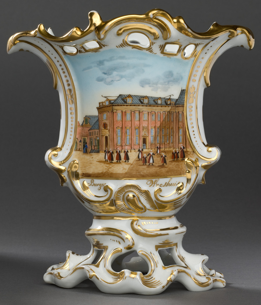 Wit porselein, polychroom beschilderd en verguld. Gewelfde, deels opengewerkte voet, samengesteld uit C en S-vormige voluten in reliëf. Vaasvormig lichaam, de voor- en achterzijde afgeplat, geflankeerd door C en S-vormige voluten in reliëf, deels verguld.Bovenrand geschulpt en deels opengewerkt. De voorzijde polychroom beschilderd met spelende weesmeisjes op de meisjesbinnenplaats van het Burgerweeshuis te Amsterdam.