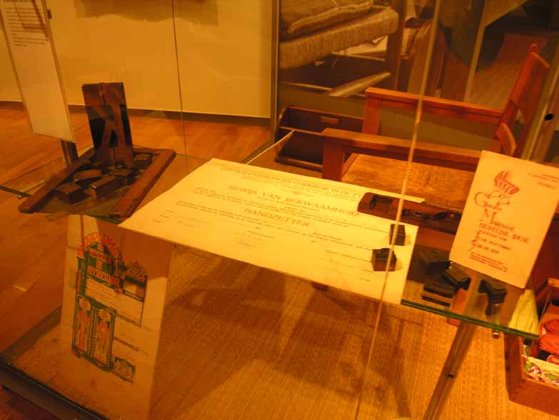 25-loden blokje; locomotief, 26-loden blokje; piano, 27-loden blokje; man met paard, 28-loden blokje; koe, 29-loden blokje; varken, 30-houten blokje; letter B, 31-houten blokje; letter H, 32- houten blokje letter d, 33-loden blokje; letter H, 34-loden blokje; letter J, 35- loden blokje; met onduidelijke voorstelling, 36- negen kleine loden blokjes bij elkaar gebonden vormen samen het woord; ontvangen, 37-smal plakje lood met op de smalle kant de tekst; SCHOOL VAN WIJCKSTRAAT, 38- reserve materiaal (?); twee kleine staafjes lood en klein plaatje koper, 39- (1-3): drie koperen vulselstrips voor het opmaken van loodzetsels).