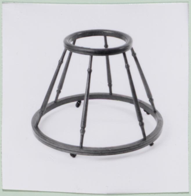 Kleine bovenhoepel, d.m.v. zes geprofileerde staanders verbonden met grotere onderhoepel, waaronder vijf zwenkwieltjes. Op de hoepels zwarte biesjes. Beide hoepels zijn uit één stuk hout vervaardigd en op één punt vastgeschroefd- Trefwoorden