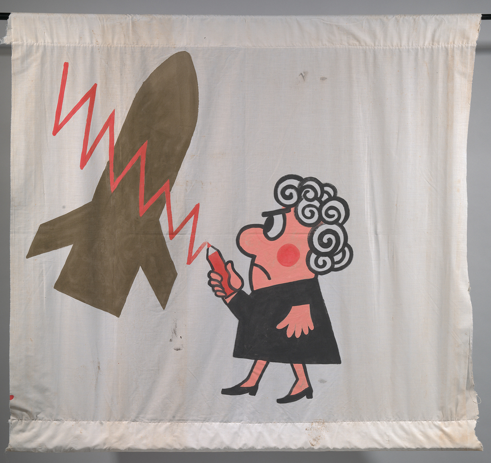 Veel mensen zullen zich nog de grote vredesdemonstraties van de jaren tachtig herinneren. Op 21 november 1981 was het Museumplein te klein om de vele honderdduizenden mensen te herbergen die van heinde en verre naar Amsterdam toestroomden. Het Nederlandse verzet tegen kernwapens was zo groot dat men in de Verenigde Staten de term ‘Hollanditis’ uitvond. Vanaf 1982 organiseerde ‘Komitee Kruisraketten Nee’ de demonstraties, o.a. de demonstratie van 10 mei 1984 op het Museumplein. Dit spandoek werd door de organisatie bij het Amstelstation opgehangen. Afgebeeld zien we een variant op het boze vrouwtje dat tegen een raket aanschopt – het beroemde beeldmerk dat politiek cartoonist Opland in 1981 voor de anti-kernwapenbeweging heeft ontworpen (zie ook KA 18794). Opland oogstte er zelfs in het buitenland bekendheid mee. Het boze vrouwtje werd hét symbool voor de Hollanditis. ( Maarten Jansen)