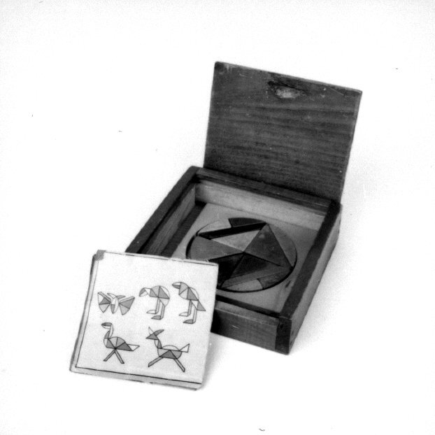 Kistje met schuifdeksel. Inhoud: los plankje met een ronde uitsparing waarin kleine platte blokjes samen een cirkel vormen. Drie voorbeeldkaartjes.- Trefwoorden