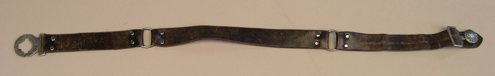 Leren riem, bestaande uit drie delen aan elkaar bevestigd met metalen ringen, metalen sluiting met Franse lelie en opschrift "weest paraat"- Trefwoorden