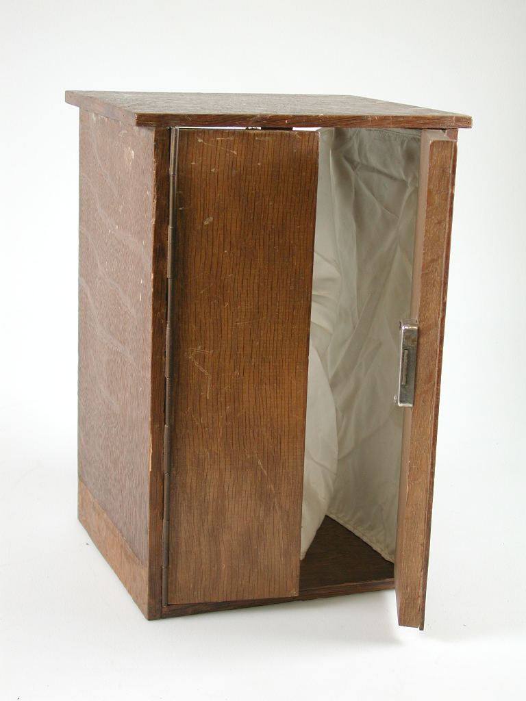 Rechthoekig kastje met twee scharnierende deurtjes, met slot. Binnenzijde kastje bekleed met witte zijde en katoen, bevestigd met punaises en spijkertjes.