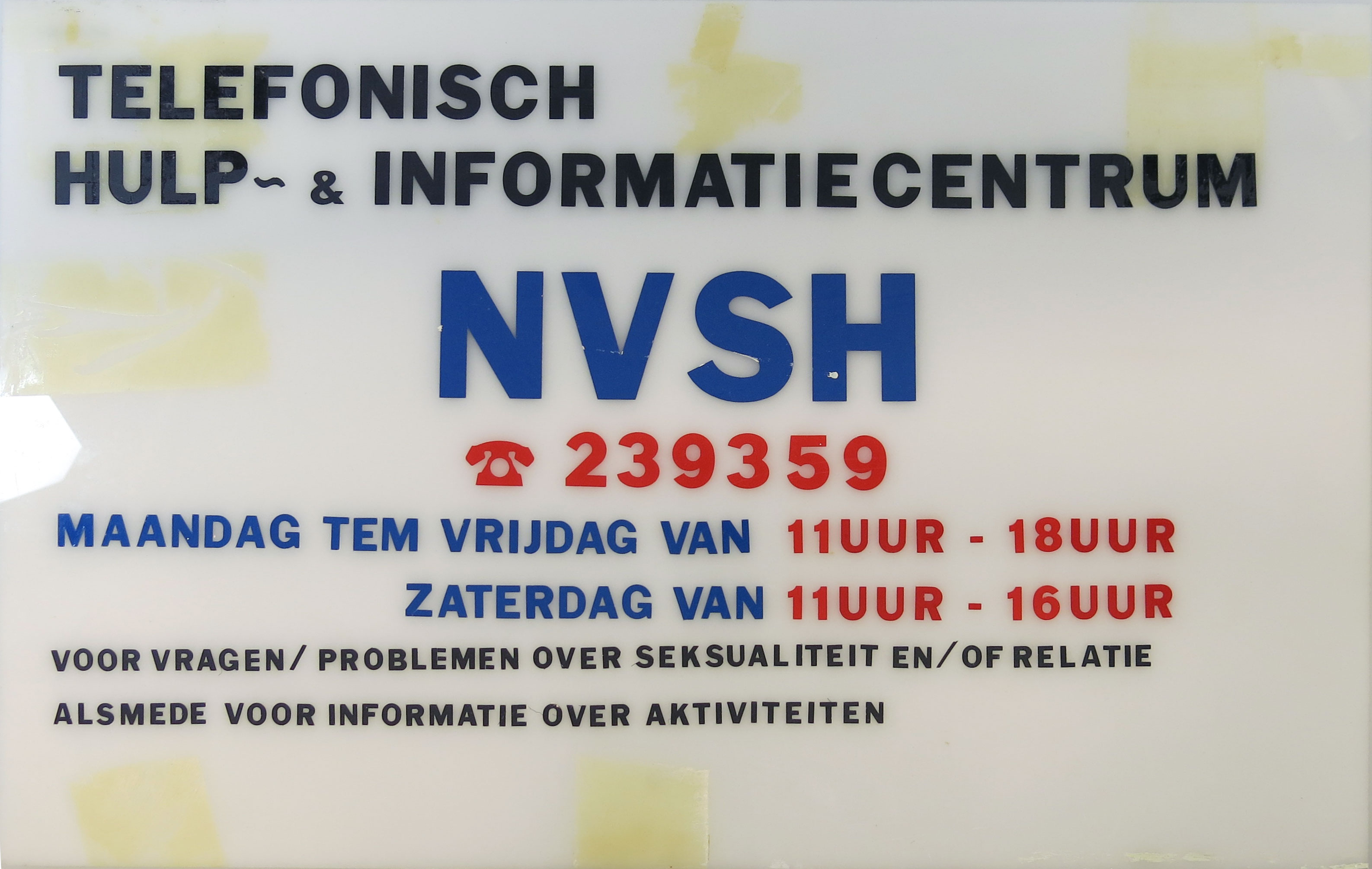 opschrift voorzijde: TELEFONISCH/HULP- & INFORMATIECENTRUM/NVSH/ 239359/MAANDAG TEM VRIJDAG VAN 11 UUR - 18 UUR/ZATERDAG VAN 11 UUR - 16 UUR/VOOR VRAGEN/PROBLEMEN OVER SEKSUALITEIT EN/OF RELATIE/ ALSMEDE VOOR INFORMATIE OVER AKTIVITEITEN: zwarte, blauwe en rode plakletters