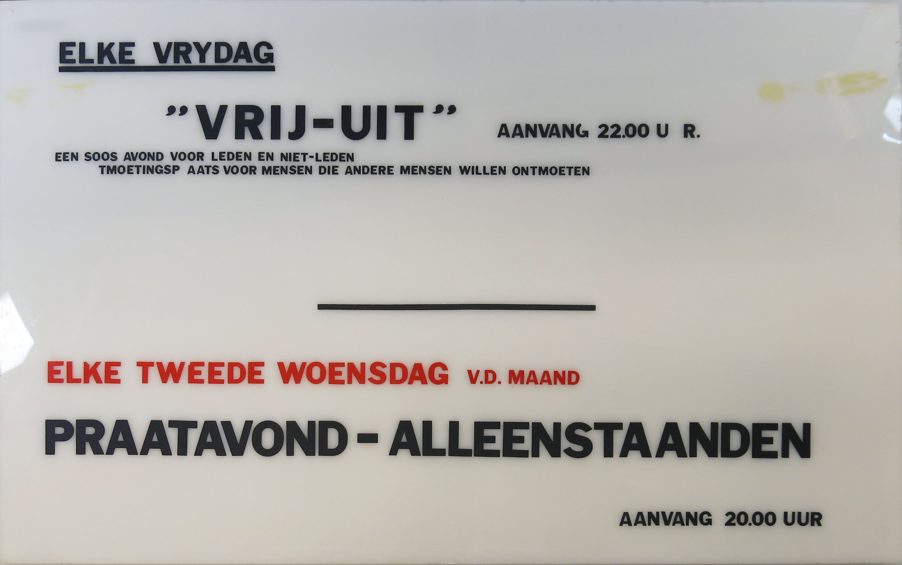 - opschrift voorzijde: ELKE VRIJDAG/´´VRIJ-UIT´´ aanvang 22.00 uur./een soos avond voor leden en niet-leden/ ontmoetingsplaats voor mensen die andere mensen willen ontmoeten/______________/ELKE TWEEDE WOENSDAG v.d. MAAND/PRAATAVOND-ALLEENSTAANDEN/ aanvang 20.00 uur: zwarte en rode plakletters