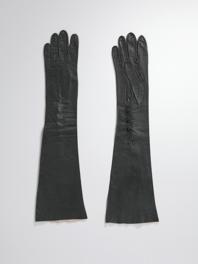 Lange handschoen, sluiting d.m.v. drie zwarte, bolle knoopjes bij de pols- Trefwoorden