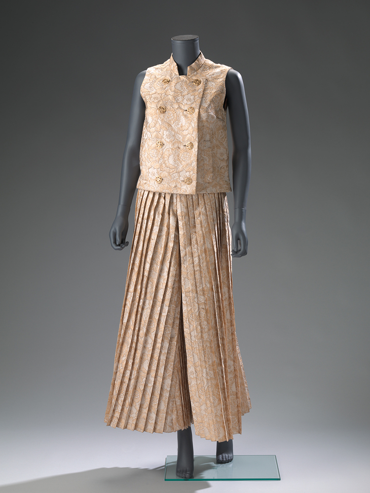Broekrok van zijde (?) brokaat ingeweven met goudkleurige lurex. Recht model met lange geplisseerde pijpen. Gladde heupband van dubbele stof. In de linkerzijnaad een zalmkleurige blinde kunststof rits met metalen lopertje. De onderkant van de pijpen is afgelockt. Aan de binnenzijde van de heupband zitten vier zalmkleurige lusjes om de rok mee op te hangen. De broek is niet gevoerd.