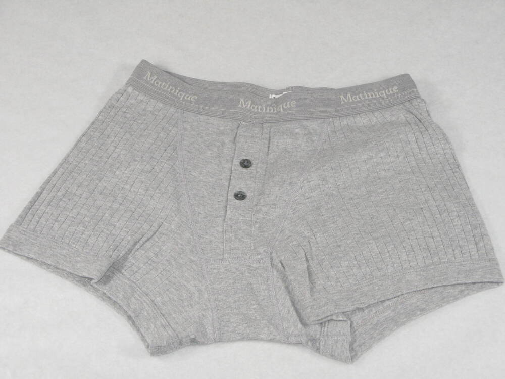 Heren onderbroek van lichtgrijs tricot. Strak aansluitende korte pijpjes, zgn. boxermodel. Elastische tailleband met ingeweven 'MATINIQUE'. Op de gulp twee grijze kunststof knoopjes, met daarop: 'BODY GEAR'.