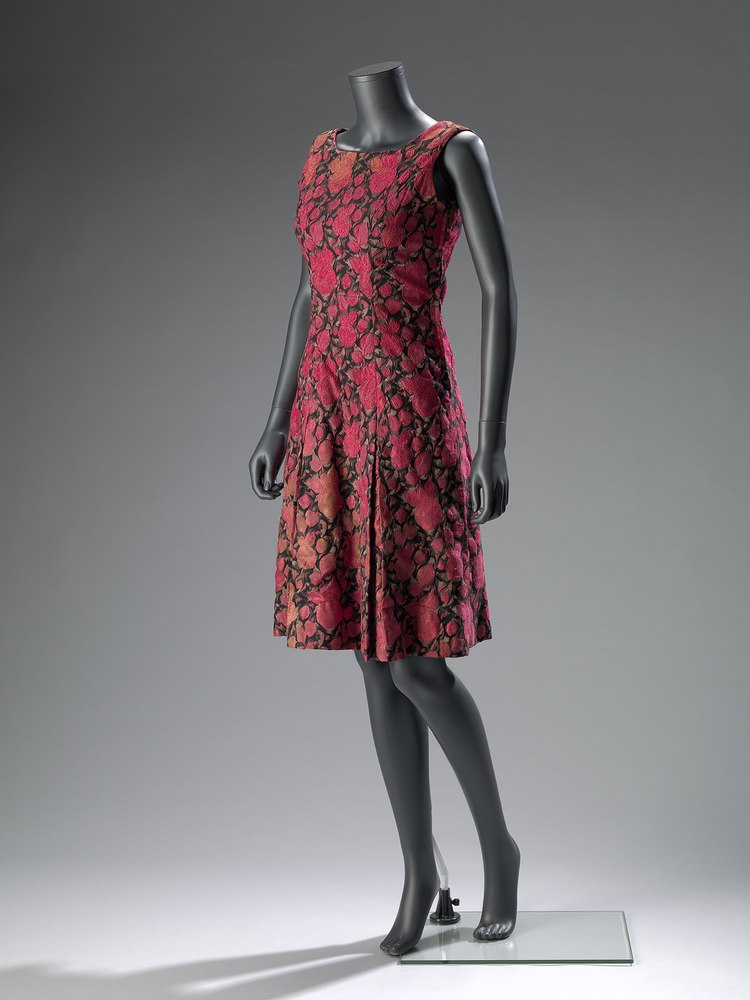 Mouwloze jurk met boothals. Vorm is prinsessenlijn. Zes stolpplooien vanaf heuphoogte. Sluiting middenachter door ritssluiting. Zwarte zijden stof met ingeweven rode rozen. Gehele jurk is op zwarte voeringzijde gezit, om de stof wat steviger te maken.