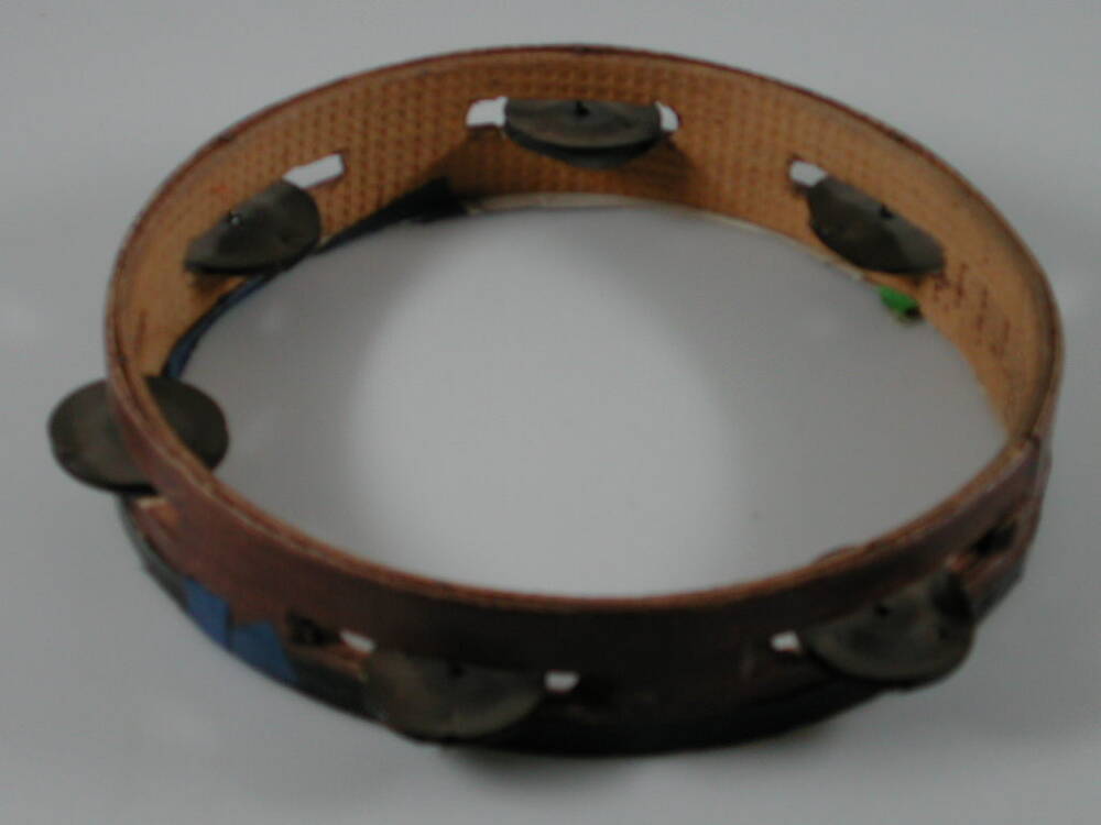 Houten tamboerijn met rondom tweemaal zes metalen bekkentjes. Beplakt met stukjes gekleurd plakband.- Trefwoorden