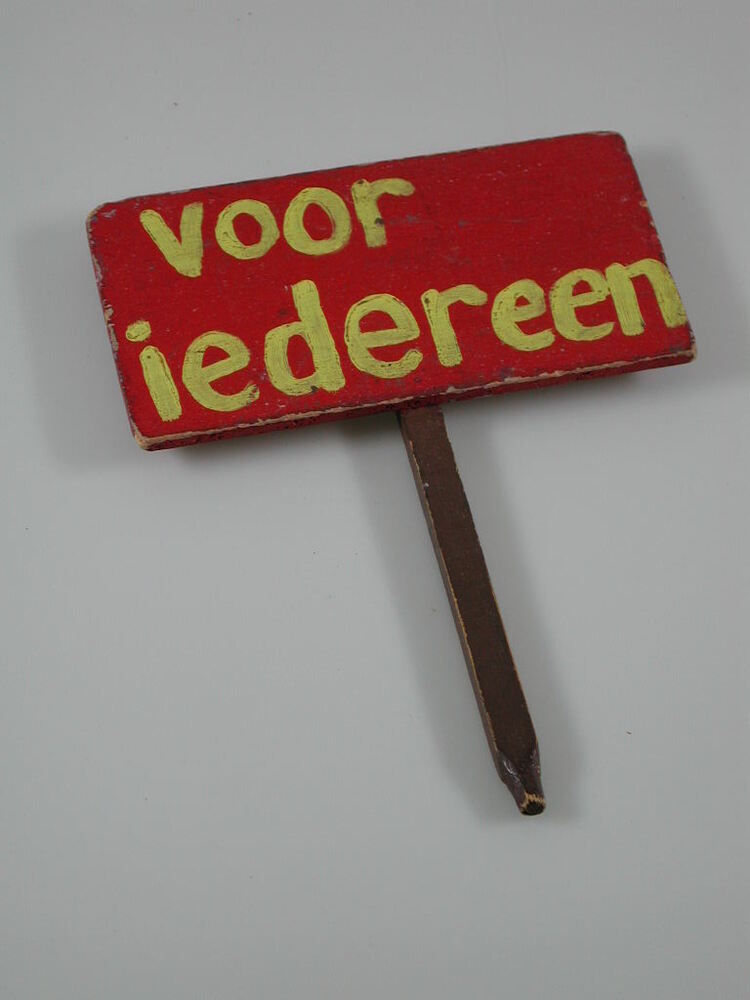 Roodgeverfd houten bordje, bevestigd aan bruin geverfde houten steel. Steel loopt uit in punt. Op bord is in gele letters VOOR IEDEREEN geschilderd.- Trefwoorden