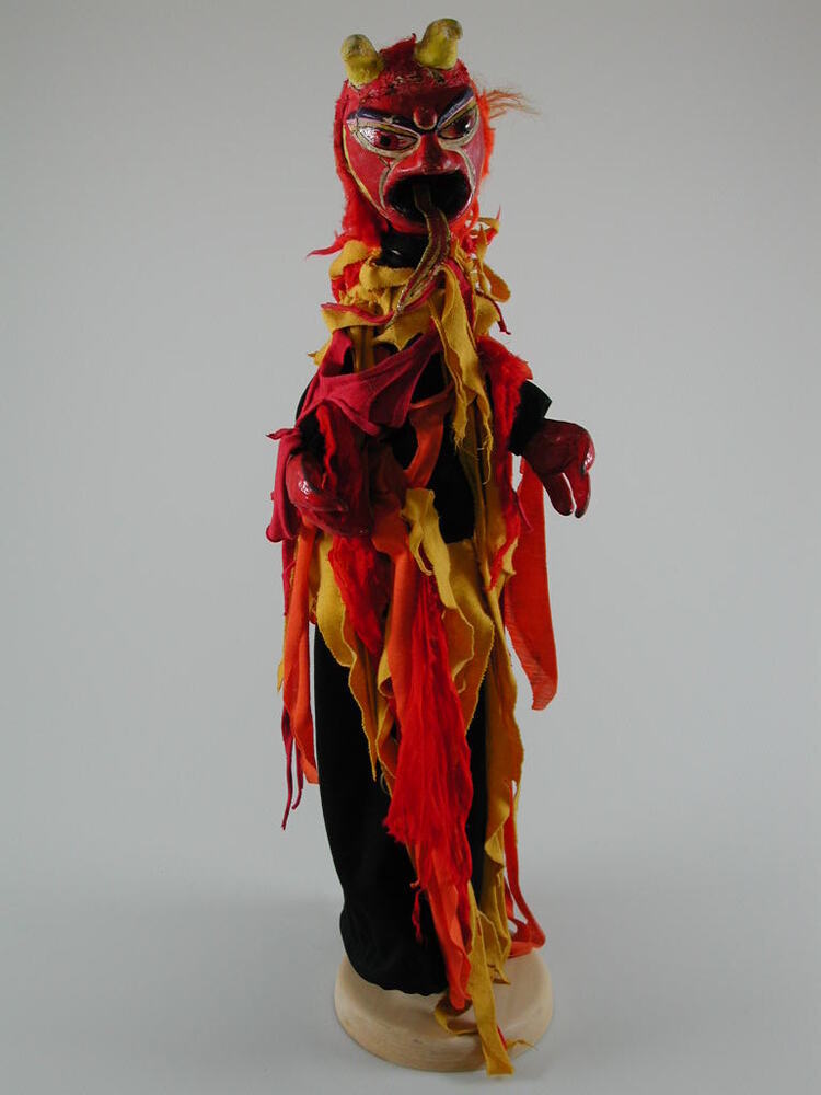 Pop van duivel met hoorntjes op kop en oranje-geel haar. Zwarte jurk bedekt met onregelmatig geknipte banden van geel, rood en oranje tricot, gezet langs hals en heupen.- Trefwoorden