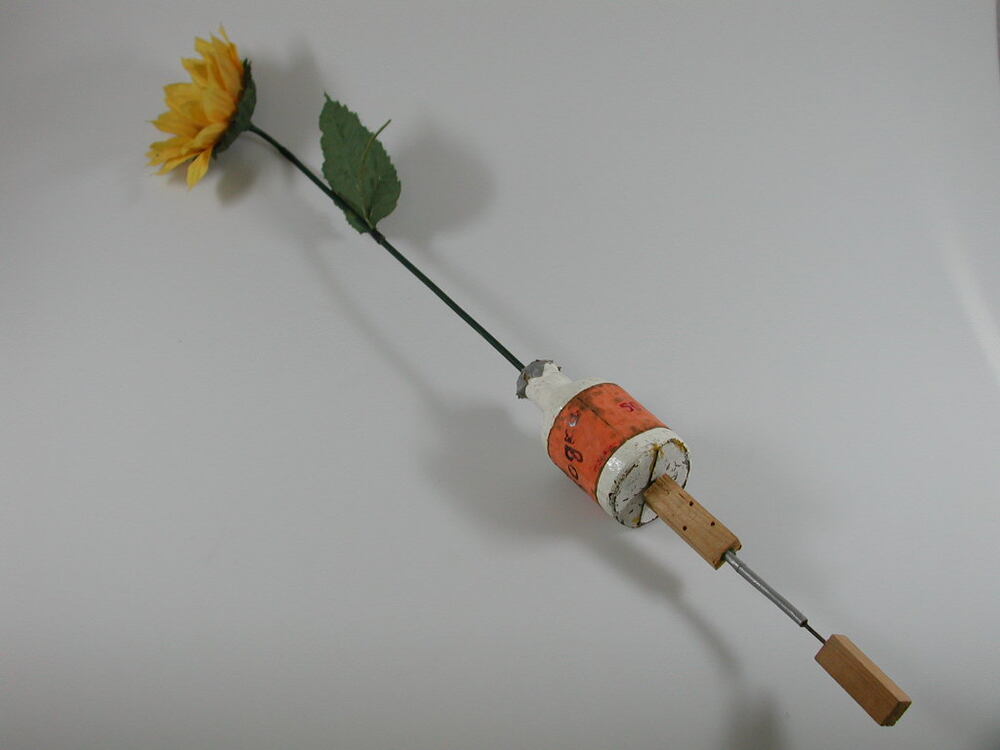 Witte fles beschilderd met oranje etiket op stok. Uit fles steekt lange kunst-zonnebloem met blad.- Trefwoorden