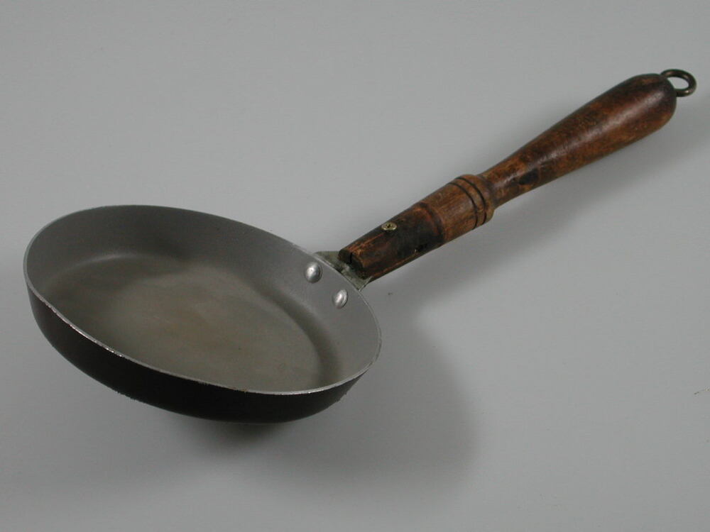 Aluminium koekenpan met houten steel. Aan uiteinde steel zit metalen oogje.- Trefwoorden