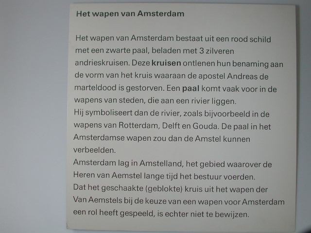 Vierkant tekstbord, geverfd in gebroken wit. Aan voorzijde (begin van) tekst over het wapen van Amsterdam.- Trefwoorden