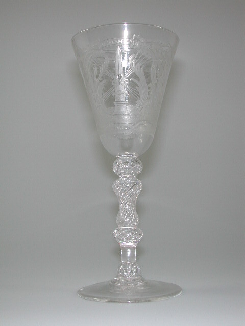 Helder kleurloos glas. Licht conische voet. Basisknoop met gedraaide luchtbellen. Balusterstam met gedraaide luchtspiralen tussen twee knopen met gedraaide luchtbellen. Conische kelk met afgeronde basis. Op voorzijde van kelk een cartouche van bladranken, C-voluten en bloemslingers, waarin een obelisk, twee gekruiste pijlenbundels van elk vier pijlen en twee schuddende handen. Boven cartouche het opschrift: UNO ANIMO. Onder cartouche een slang, zich om een liggende boomtak kronkelend. Op achterzijde van kelk het opschrift: STAAF, EENSGESINDHEID, STAAF DEES MAATSCHAPPY VAN AGT/ GENEESKUNST TOEGEWYD DOR VRINDSCHAP SAAMGEBRAGT.