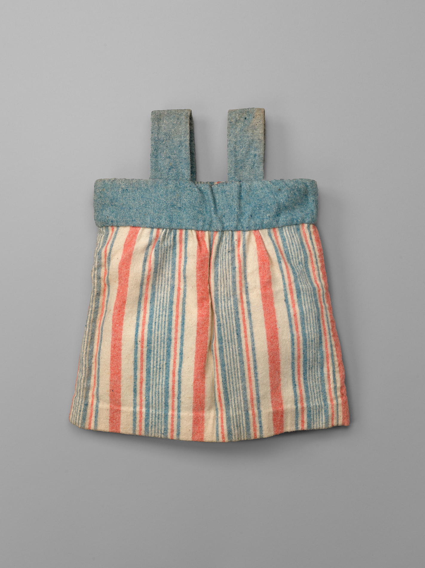 Poppenovergooier van gestreepte molton. Op borsthoogte aan band van blauwe molton gezet, met blauwe schouderbanden.- Trefwoorden