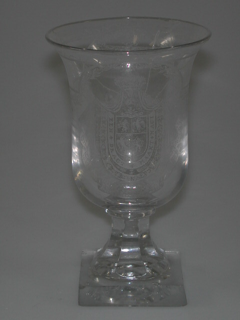 Helder kleurloos glas. Vierkante verdikte voet, overgaand in korte stam met knoop. Klokvormige kelk. Op voorzijde is gegraveerd een bladomkranst wapen van Lodewijk Napoleon, koning van Holland. Op achterzijde is een ordeteken gegraveerd.- Trefwoorden