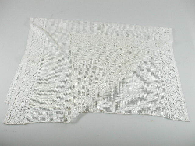 Naturelkleurige doek van vitragestof met decoratie van bloemen en bladeren langs zijkanten.- Trefwoorden