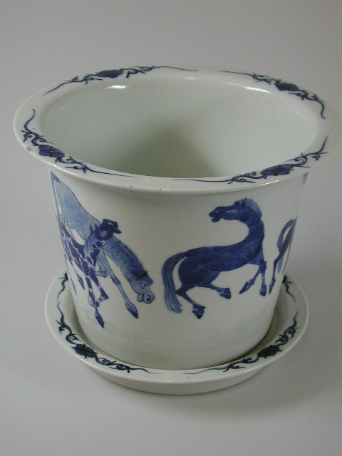 Aardewerk pot, wit geglazuurd, daarop in blauw paarden geschilderd. In midden van onderschotel zitten twee gaten. Op onderzijde staan tussen twee gaten zes Chinese karakters.- Trefwoorden