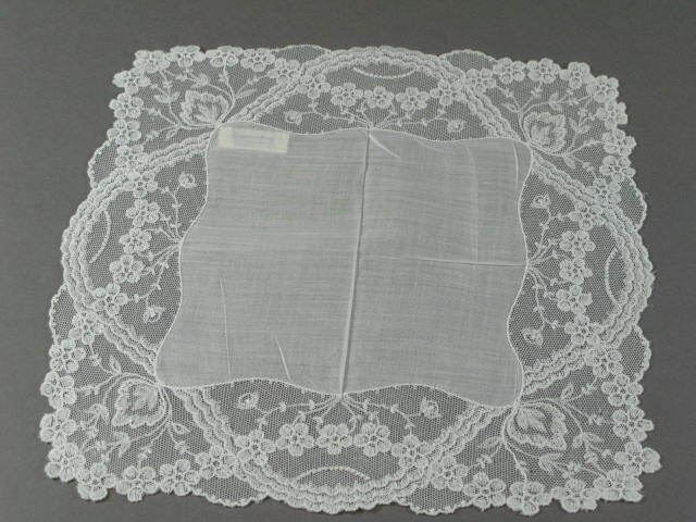 Zakdoek van dunne batist, rondom afgezet met brede strook machinale kant.- Trefwoorden