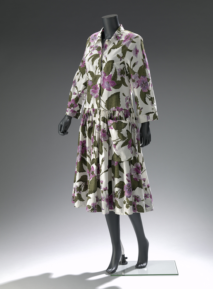 Jurk van naturelkleurige katoen met opdruk van grote bloemen met bladeren in kleuren paars, roze en groen. Verlaagde taille, hooggesloten kraag en laag ingezette lange mouwen. Rok is gerimpeld aan lijfje gezet, op linkerzijde rok is losse opgestikte zak geplaatst. Brede zoom van 8 cm, om de centimeter doorgestikt waardoor onderzijde verstevigd is en wat uitstaat. Sluiting middenvoor met vijf knopen en knoopsgaten.