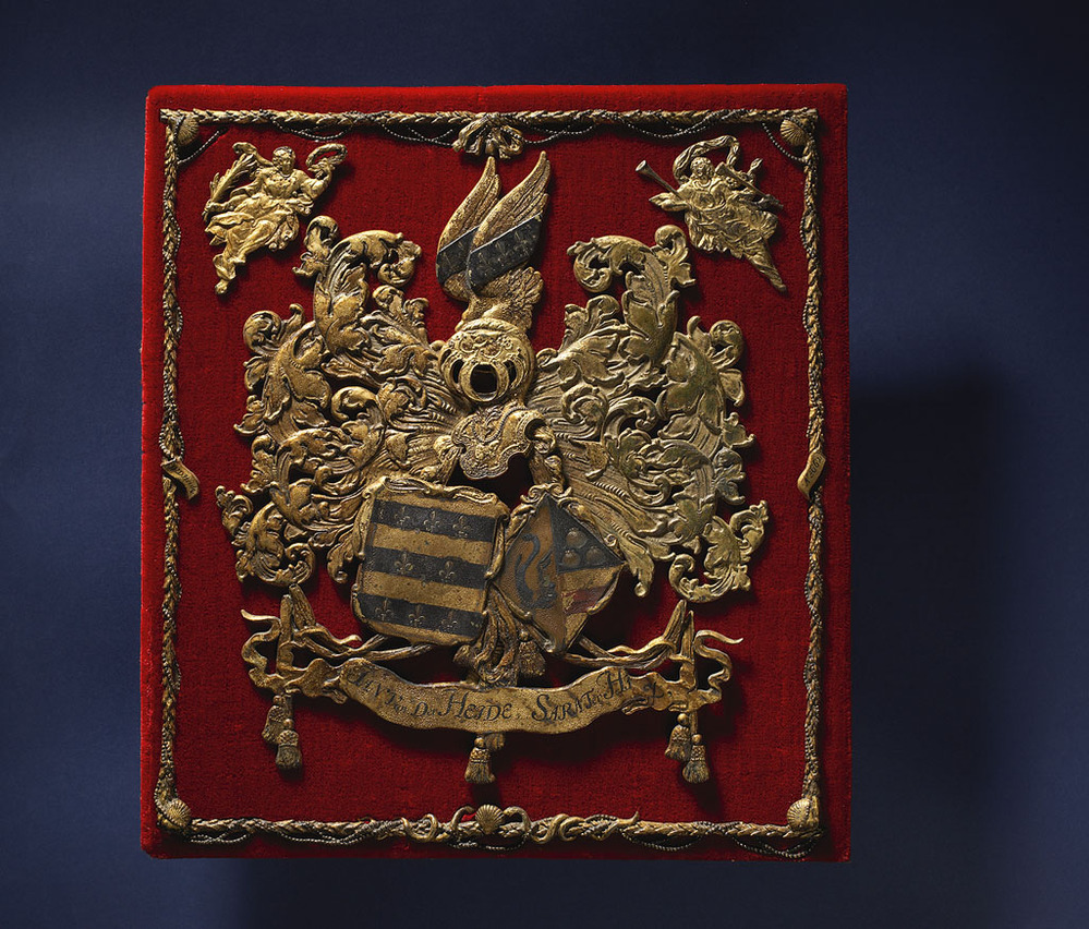 Alliantiewapen in eikenhoutenlijst op rood fluwelen fond, van Jan van der Heyden en zijn vrouw, Sara ter Hiel, met helmteken en banderol, waarop de namen zijn aangebracht. In elk van de bovenhoeken een zwevende engel. Het geheel in kader van koperen koord met snoeren, slangen en schelpen.