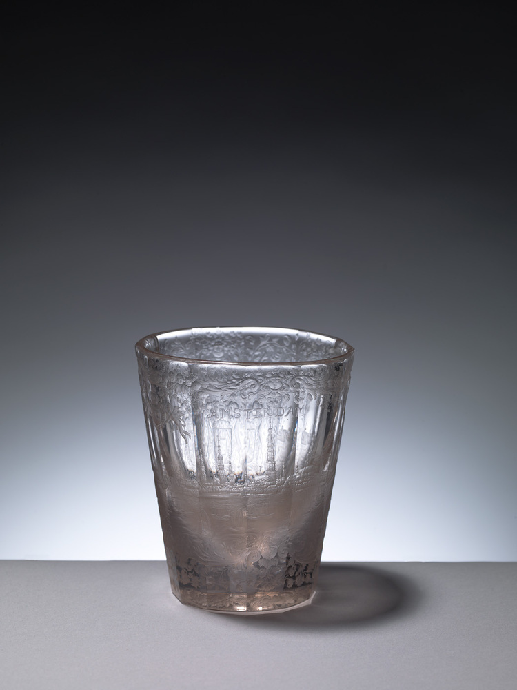 Helder kleurloos glas. Vlakke verdikte bodem. Conisch gefacetteerd lichaam, de binnenzijde naar beneden toe spits toelopend door massieve verdikking. Op lichaam een geornamenteerd cartouche gevormd door bladwerk, vruchten, halffiguren, maskers en leeuwenkoppen, waarin het stadsprofiel van Amsterdam gezien vanaf het IJ en het opschrift: AMSTERDAM/, het gekroonde stadswapen en het koggeschip, gehouden door engelen. Twee niet geïdentificeerde familiewapens op andere zijde lichaam en op onderzijde bodem.