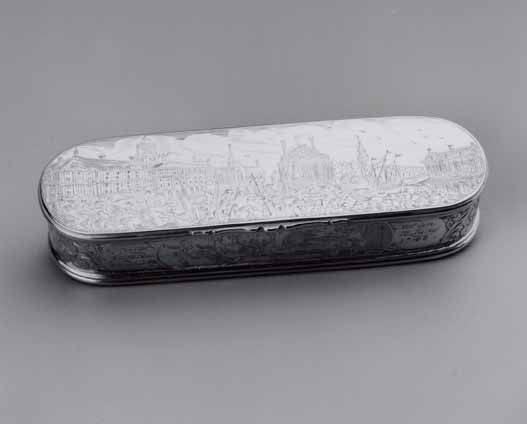 Langwerpige doos met afgeronde korte zijden, rechte wand en scharnierend deksel met duimstuk. Bodem, wand en deksel gegraveerd met voorstellingen van het Pachtersoproer te Amsterdam, 1748. Op bodem: de plundering van huizen aan een gracht. Op voorzijde wand: een schietpartij met fatale afloop, geflankeerd door medaillons met de opschriften: Oproer tot/ Amsterdam/ Van den 24/ en: tot den/ 28 Junij/ 1748./, waartussen bloem- en bladranken en medaillons waarin het opschrift: De Zweed Gedoot/. Op deksel: ongeregeldheden tijdens de openbare terechtstelling op de Dam van de twee aanstichters van het oproer. Op sluitrand zijn de initialen: JKS/ gegraveerd.