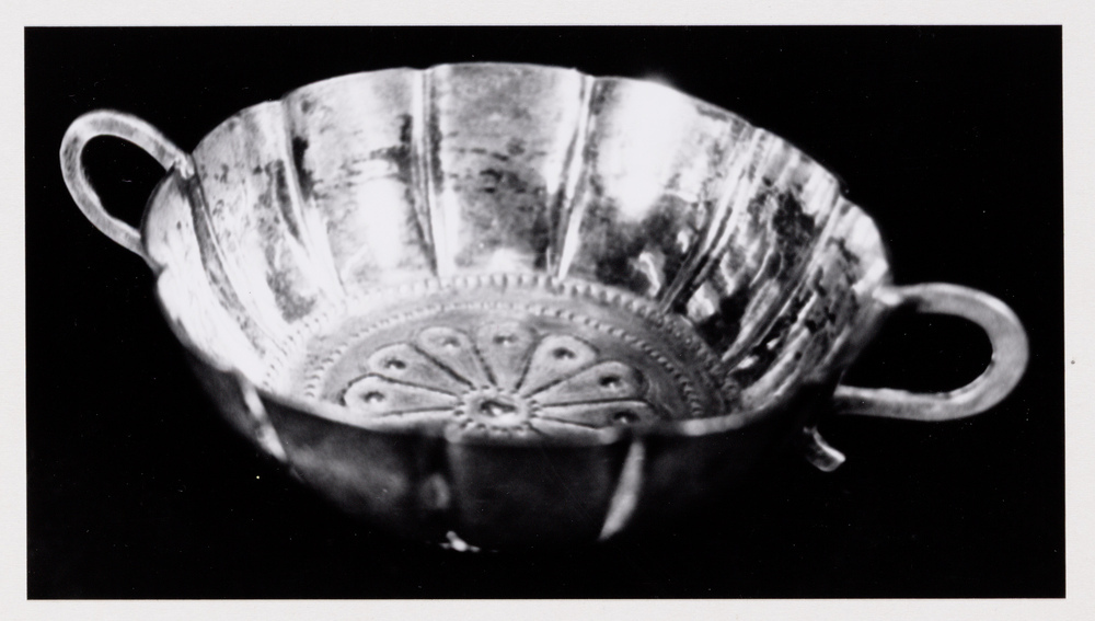 Een gelobd kommetje met twee verticale, platte S-vormige oortjes. In de bodem een gedreven rozet.- Trefwoorden