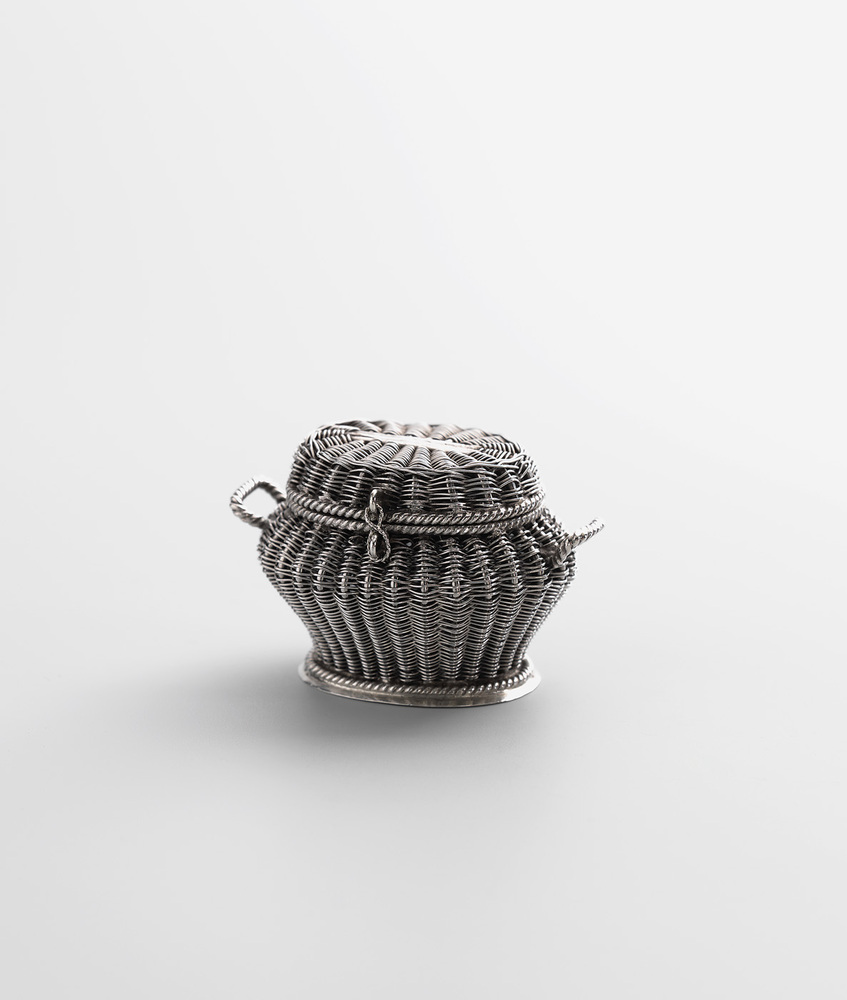 worden afgesloten. De bodemplaat en de sluitrand van het deksel zijn gemaakt van plaatmateriaal. Een eeuw eerder zou een zilversmid niet hebben gekozen voor zo’n constructiewijze maar de complete mand van gevlochten draad hebben gemaakt. ( Bert Vreeken)