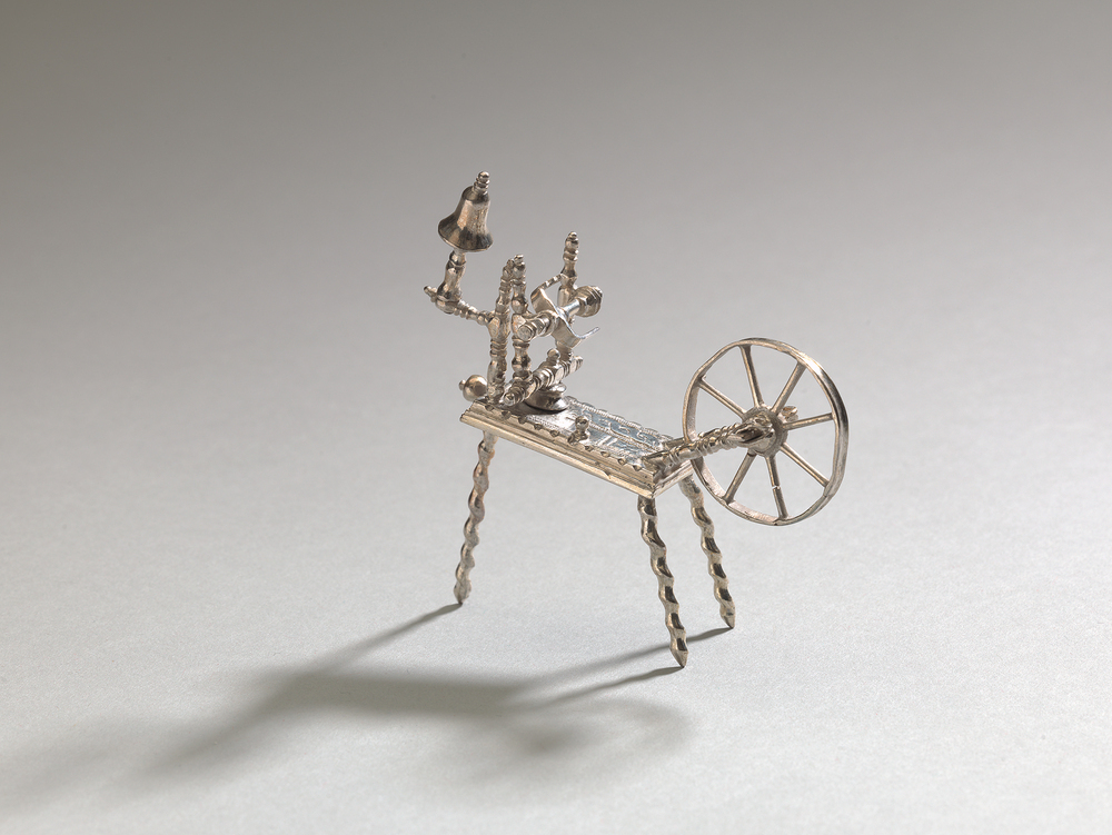 Spinnewiel zonder trapmechanisme op drie getorste pootjes met rechthoekige versierde tafel.