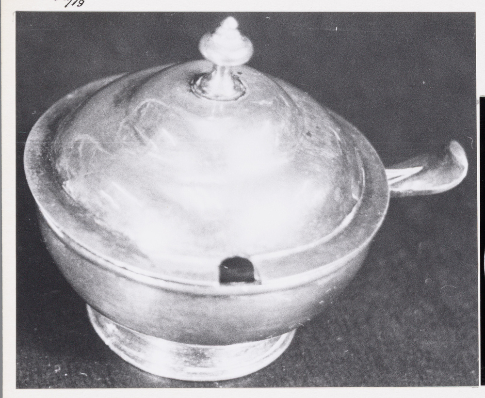 Soepterrine, 1759 Amsterdam zilver hoogte: 3.8 cm; breedte: 4.6 cm; diameter: 37 cm; gewicht: 31.79 gram; stadskeur met jaarletter onderzijde terrine: stadskeur