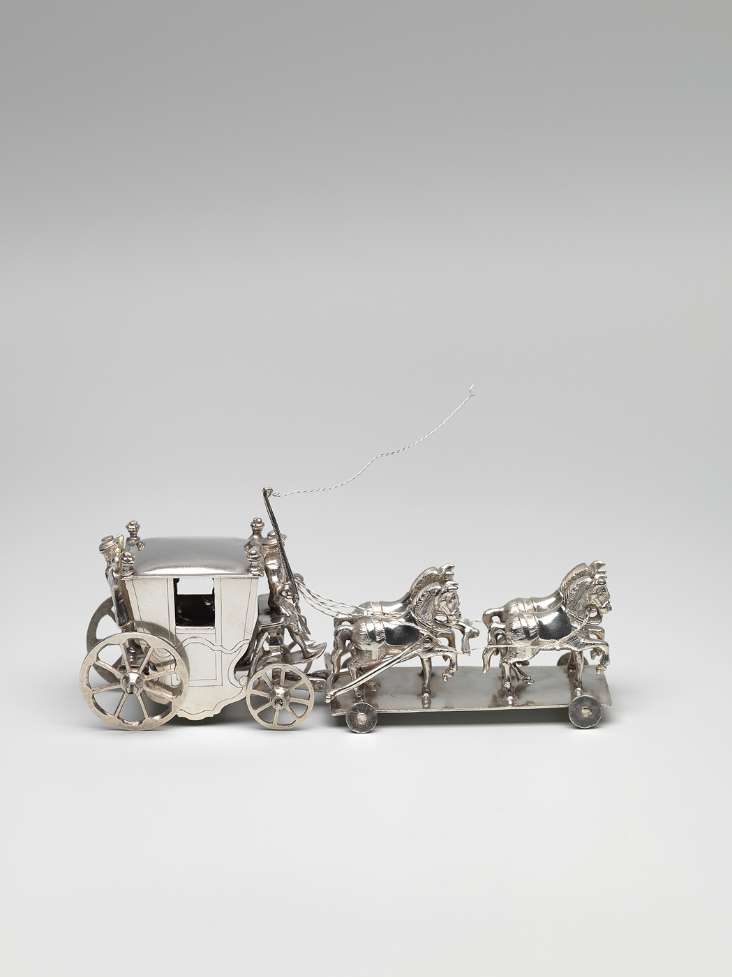 Bijna vierkante koets met twee kleine en twee grote gespaakte wielen, met op de achterzijde een staande palfrenier en op de bok een koetsier met rechts een zweep en in zijn linker hand een gat voor de teugels; in de koets zitten een man en een vrouw. Disselboom waaraan vier paarden op een rechthoekige gladde grondplaat op vier wieltjes.