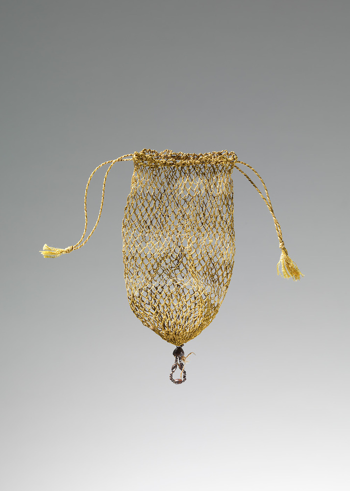 Beursje van geknoopt netwerk met horizontale banen in crême en bronsgroen, van boven gesloten met twee koordjes, onderaan een kwastje dat oorspronkelijk bestond uit drie lusjes van geregen metalen kraaltjes, waarvan een lustje resteert.- Trefwoorden