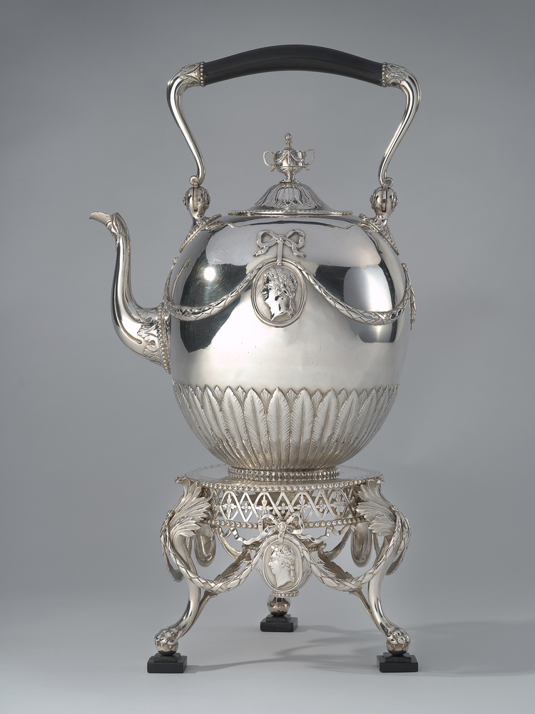 Bouilloire met deksel op komfoor met brander. Ronde opengewerkte komfoor op S-vormige poten uitlopend in klauwpoten en versierd met acanthusbladeren. Tussen de poten een guirlande met een portretmedailjon aan een strik. Halfronde brander versierd met acanthusbladeren en parelrand. Ketel met bolvormig lichaam op standring. Op het lichaam een guirlande en portretmedailjon aan een strik. De onderzijde versierd met acanthusbladeren. H-vormig hengsel met cannalures en ebbenhouten greep. Deksel voorzien van een urnvormige vaas.