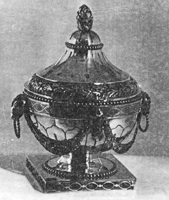 Urnvormige pot met afhangende guirlandes, ramskoppen, een gegraveerde band en een bladkrans om het deksel, staande op vierkante voet.