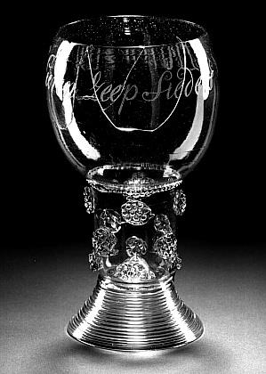 Helder groen glas. Conische voet van gesponnen glasdraad. Ingestoken bodem. Cilindrische schacht met twee rijen braamnoppen, aan één stuk geblazen met bolvormige kelk. Op kelk het opschrift: 't welvaren van de Heeren Zeep Sieders/. Geribde glasdraad op overgang schacht en kelk.